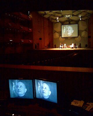 Tonight, Tuesday June 24, the American Guild of Organists will present Apparition of the Eternal Church - the film of which Albert is both star and muse - in Orchestra Hall in Minneapolis. The picture above is from this morning's sound check, with the Ondes Martenon players setting up below the screen for tonight's 8 p.m. Messiaen centenary tribute concert. The film, which is open to the public free of charge, starts after the concert, probably around 9:30 or a little later.